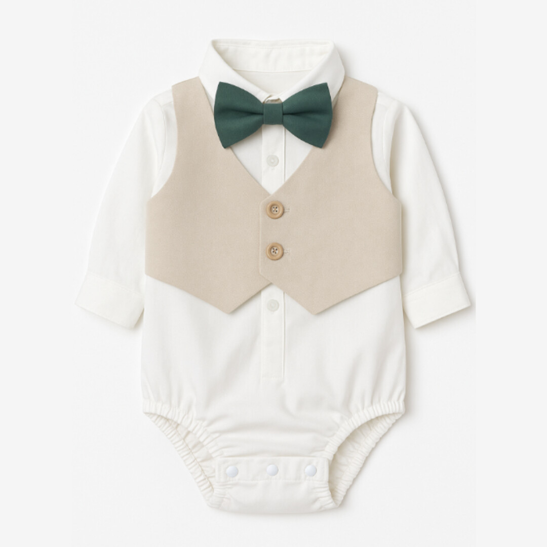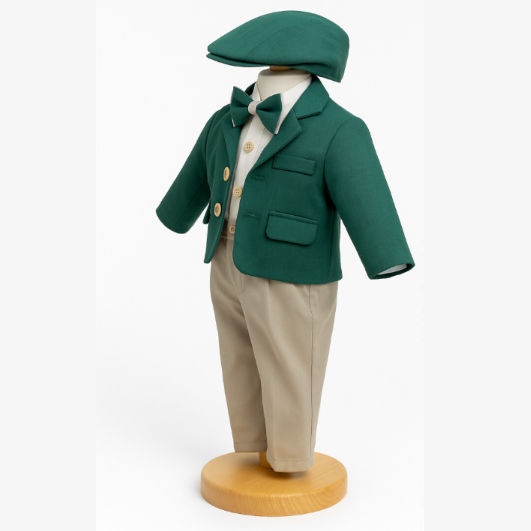Costum Botez Băieți Albastru Elegant – Set 5 Piese (Sacou, Body Cămașă, Papion, Pantalon, Beretă) – 3-12 Luni, Verde.