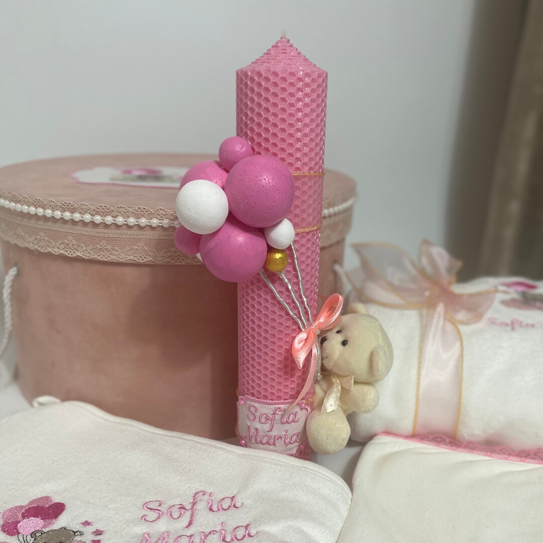 Lumanare de botez, Ceara naturala, Personalizata, Ursulet roz cu bile.