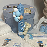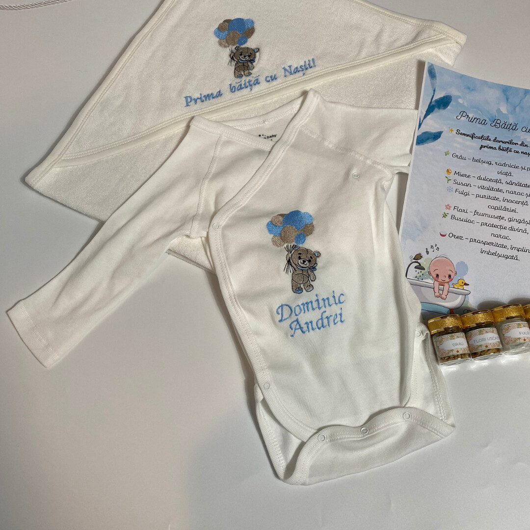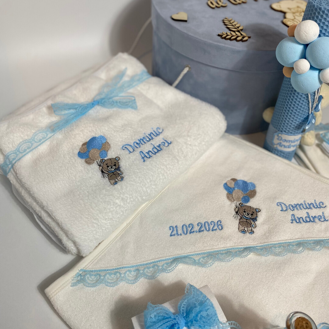Trusou Botez ,Brodat, Ursulet cu baloane , Complet cu 7 elemente, Personalizat, Elegant.